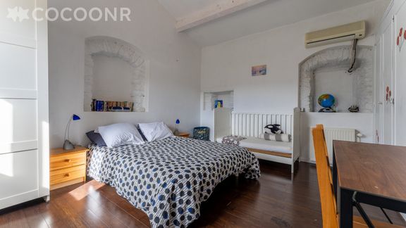 - Chambre 1 : un lit double (140×190) avec bureau et lit bébé