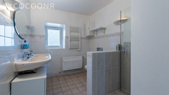 - Une salle d'eau avec douche, double vasque, lave-linge, sèche-serviettes, WC