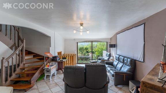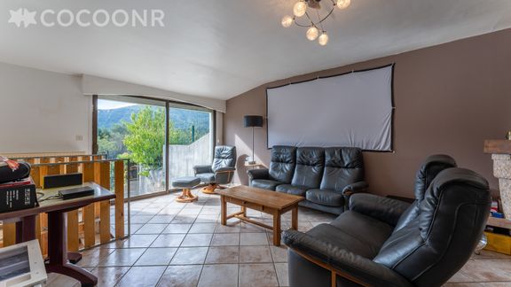 - Une pièce de vie de 46 m² avec cheminée (bois fourni), rétroprojecteur et écran au mur, deux canapés, un fauteuil confort avec repose pied, deux fauteuils enfants...