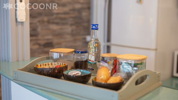 - Une cuisine équipée avec notamment : bouilloire électrique, four, four à micro-ondes, grille-pain, plaques de cuisson...