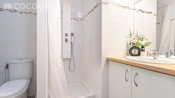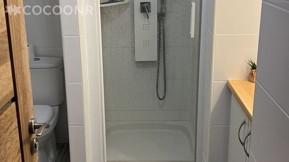 La douche de la salle de bain est assez petite, de sorte que le jet (style pluvial) envoie de l'eau à l'extérieur de la douche. Il faut faire attention à très bien fermer le rideau pour éviter de mouiller le plancher de la salle de bain. Encore ici, loin d'être un enjeu majeur.