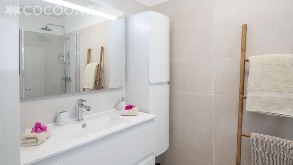- Une salle d'eau avec douche, meuble vasque, miroir et colonne de rangement