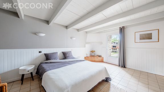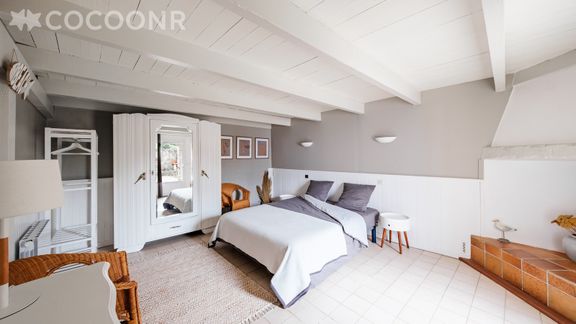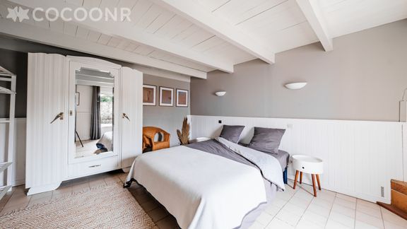 - Chambre 1 : chambre de 19 m²avec un lit queen-size (160×200), armoire, portant et un accès direct sur la jardin.