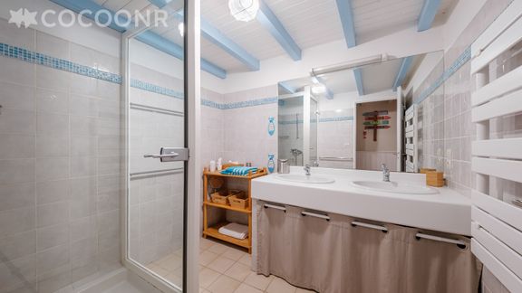 - Une salle d'eau avec douche, deux vasques, radiateur sèche-serviettes, sèche-cheveux...