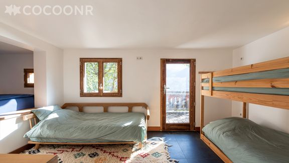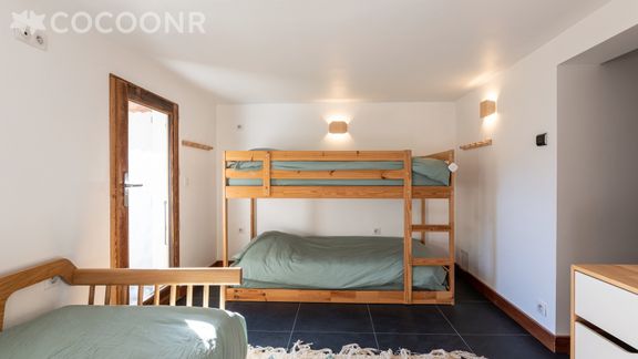 - Chambre 1 : un lit double (140×190) et un lit superposé (2 couchages), un lit simple.
