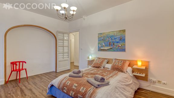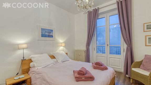 - Chambre 1 : lit double (140×190), salle d'eau privative avec douche, balcon attenant
