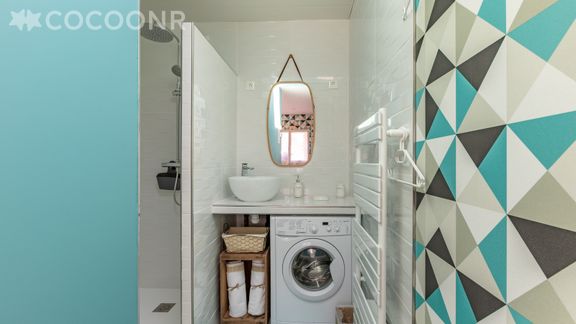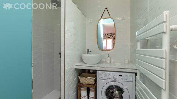 - Salle d'eau avec douche à l'Italienne, vasque, sèche-serviettes et machine à laver