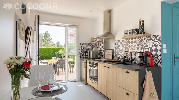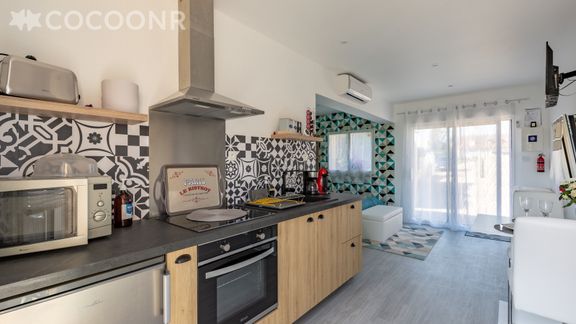 - Cuisine ouverte et équipée (four, plaques à induction, réfrigérateur, micro-ondes, grille-pain, 2 cafetières, vaisselle et couverts)