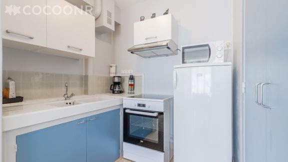 - Une kitchenette ouverte et équipée avec notamment : bouilloire électrique, four, four à micro-ondes, grille-pain, plaques de cuisson...