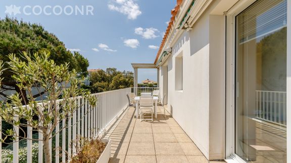 - Un balcon de 20 m² exposé plein sud avec 2 stores bannes pour se protéger du soleil de l’après-midi et avec mobilier pour profiter des beaux jours