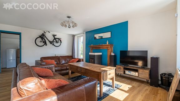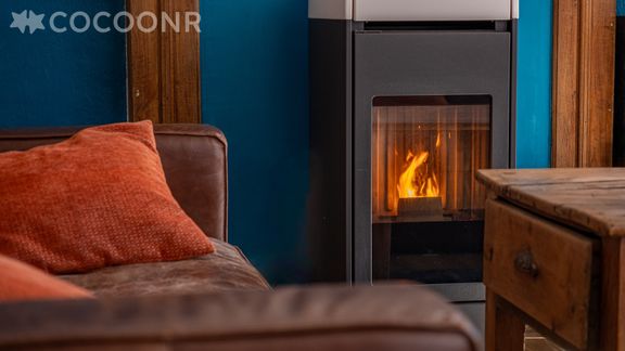 - Une pièce de vie avec canapé, TV, coin repas et poêle à granulés (1er sac fourni)