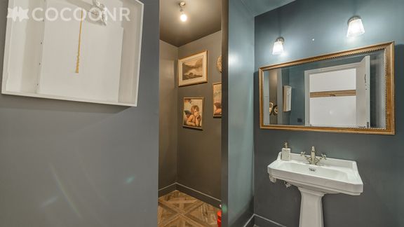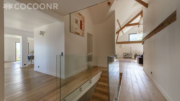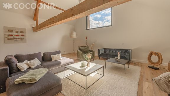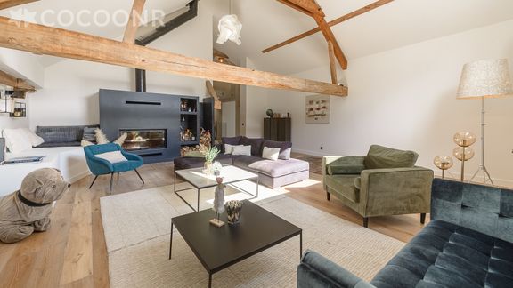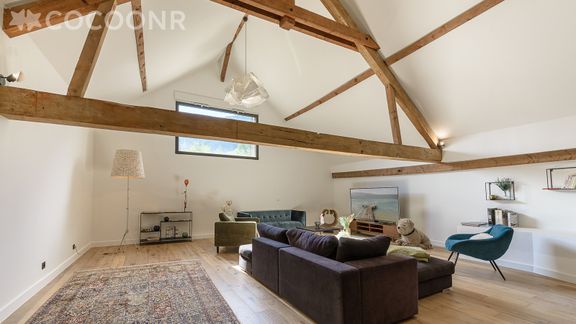 - Salon indépendant de 50m², baigné de lumière grâce à sa hauteur sous plafond de plus de 5m, avec cheminée à insert, coin lecture et poutres apparentes