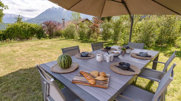 - Grand jardin ensoleillé face au lac et aux montagnes