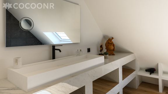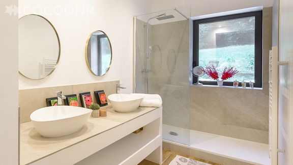 Ses volumes rares, ses matériaux haut de gamme et ses espaces de vie lumineux en font un lieu unique pour un séjour d’exception en famille ou entre amis. Cette location premium se compose comme suit :