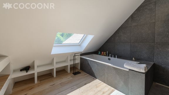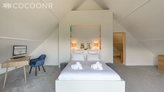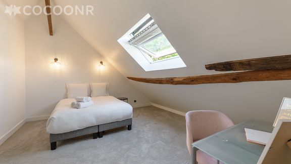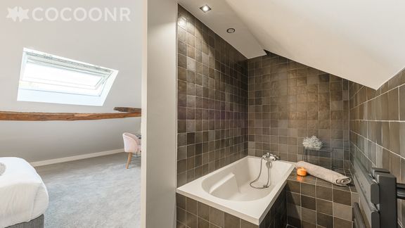 - Chambre n°3 : lit queen-size (160x190), bureau, rangements, salle de bain attenante avec baignoire