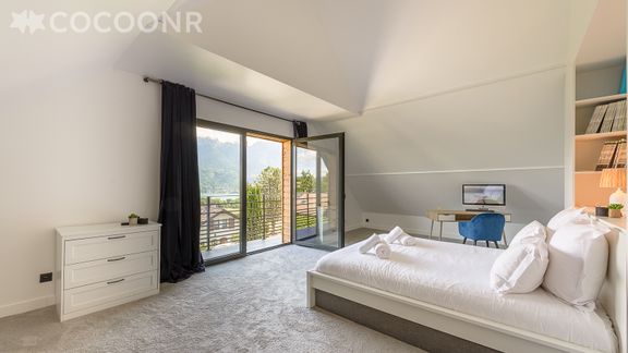 - Chambre n°4 (suite parentale de 43m²) : lit queen-size (160x190), bureau, dressing, salle de bain avec baignoire et douche, offrant une vue exceptionnelle sur le lac et les montagnes