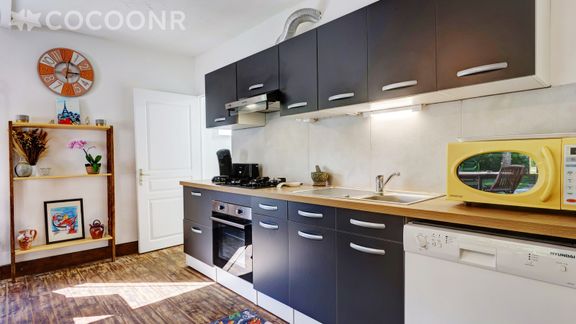 - Une cuisine équipée avec notamment : bouilloire électrique, four, four à micro-ondes, grille-pain, lave-vaisselle, plaques de cuisson...