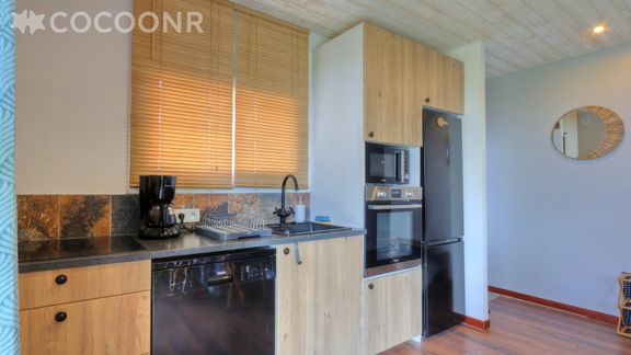 - Une cuisine équipée avec notamment : bouilloire électrique, four, four à micro-ondes, grille-pain, lave-vaisselle, plaques de cuisson...