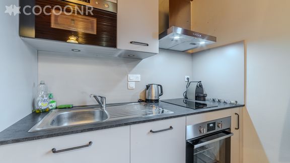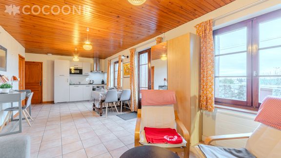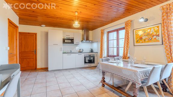 - Une pièce de vie de 27 m² avec canapé, espace repas et une cuisine équipée avec notamment : bouilloire électrique, four, four à micro-ondes, lave-vaisselle, plaques de cuisson...