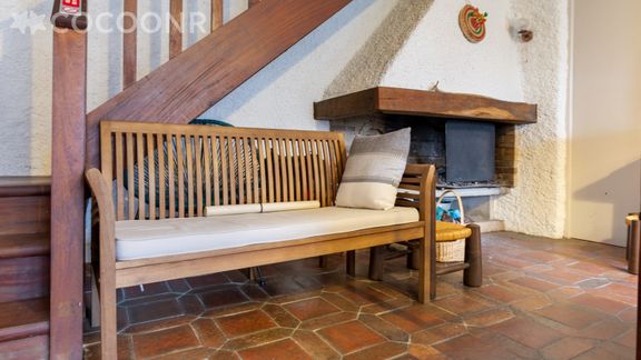 🙁 Banquette en bois (style mobilier de jardin) en guise de canapé intérieur peu confortable.
