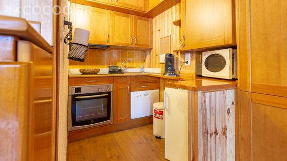 - Une cuisine ouverte équipée avec notamment : bouilloire électrique, four, four à micro-ondes, grille-pain, plaques de cuisson...