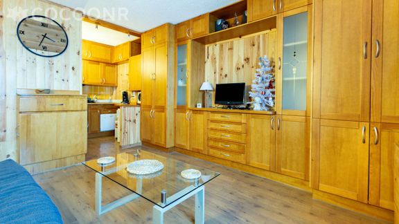 - Une pièce de vie de 12 m² avec TV, canapé-lit double, coin repas et rangements
