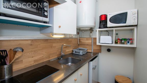 - Une cuisine équipée avec notamment : bouilloire électrique, four, four à micro-ondes, grille-pain, plaques de cuisson...