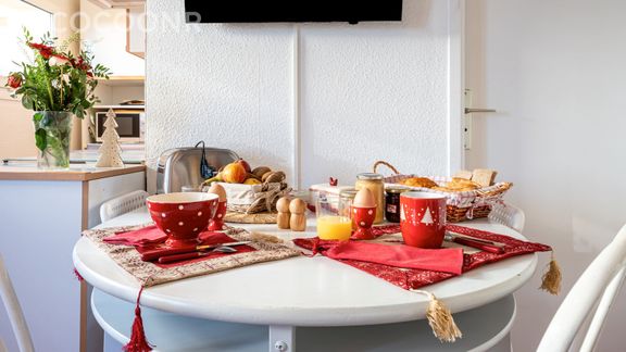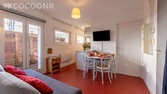 - Une pièce de vie de 28 m² avec TV, canapé-lit double et un espace repas