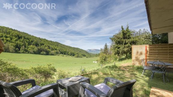 - Un jardin de 100 m² exposé plein sud vue sur les montagnes. Équipée d'un salon de jardin, table, chaises pour profiter des beaux jours