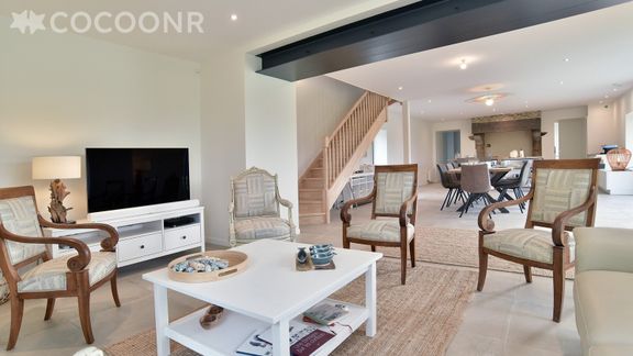 - Spacieux salon, baigné de lumière grâce à ses trois grandes baies vitrées avec TV, canapé, fauteuils...