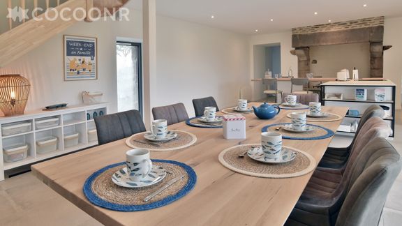 - Un coin repas convivial avec une grande table en chêne, idéale pour partager de délicieux repas en famille ou entre amis