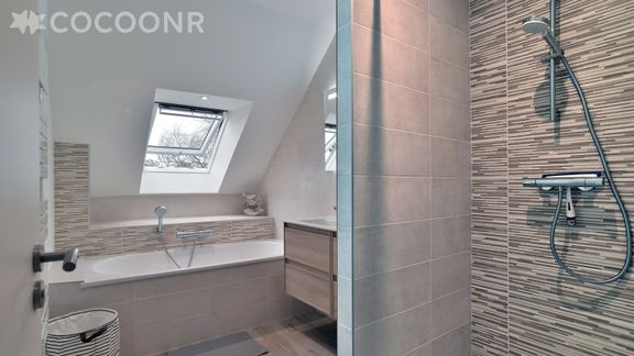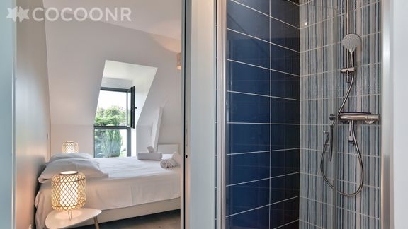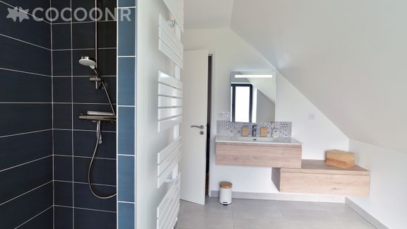 - Chambre 1 : un lit queen-size (160×200), salle d'eau avec douche attenante, meuble vasque