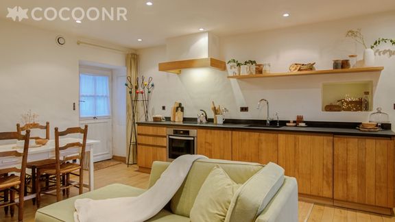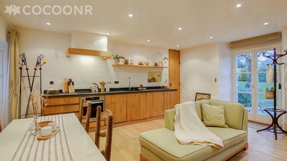 - Cuisine ouverte sur le salon, entièrement équipée : frigidaire, four, micro-onde, plaques, lave-vaisselle, grille-pain, bouilloire, cafetière Nespresso et à piston...