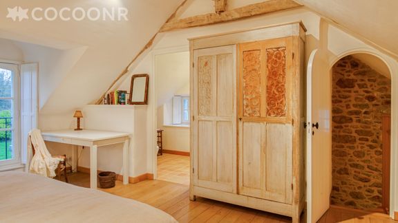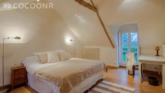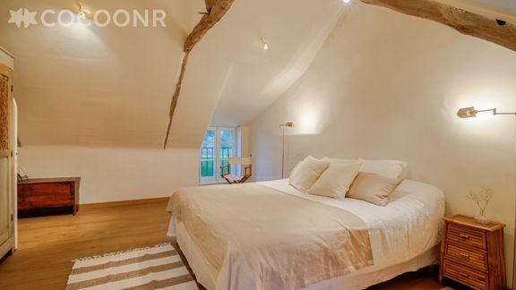 Accessible par un escalier en bois, vous découvrirez une jolie chambre mansardée avec poutres apparentes, un vrai cocon !