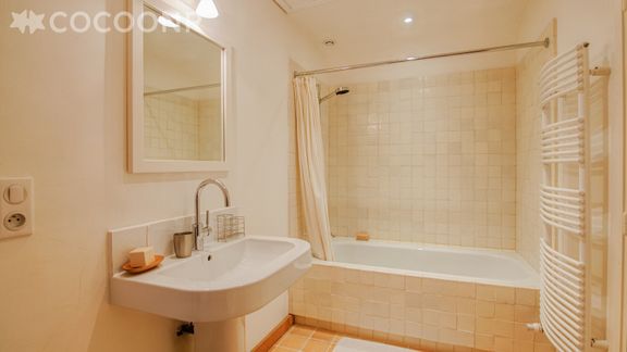 - Salle de bain accessible depuis la chambre avec baignoire, lavabo, WC