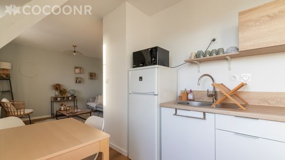 - Une cuisine équipée avec notamment : bouilloire électrique, four à micro-ondes, grille-pain, plaques de cuisson, cafetière à dosettes Dolce Gusto...