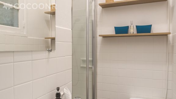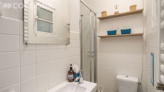 - Une salle d'eau étroite avec une douche, une vasque, un sèche-serviettes et un sèche-cheveux, wc.