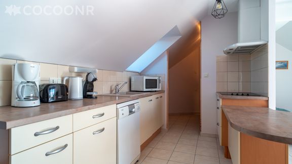- Une cuisine équipée avec notamment : bouilloire électrique, four à micro-ondes, grille-pain, lave-vaisselle, plaques de cuisson...