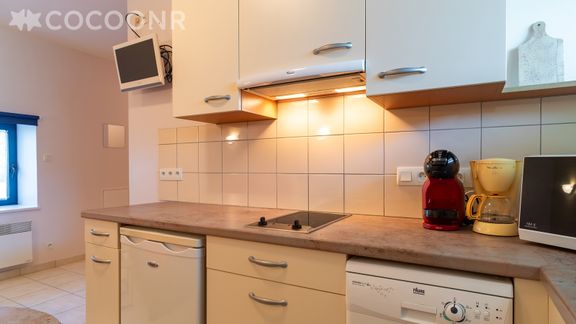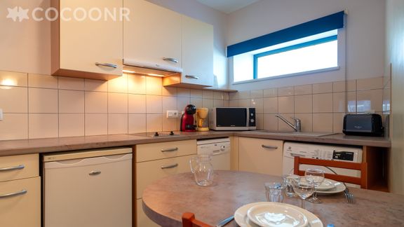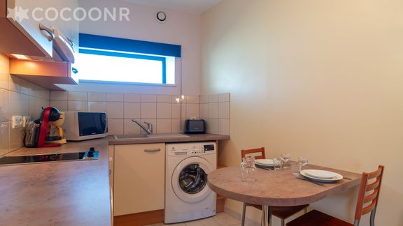 - Une cuisine équipée avec notamment : bouilloire électrique, four à micro-ondes, grille-pain, lave-vaisselle, plaques de cuisson ainsi qu'un lave-linge