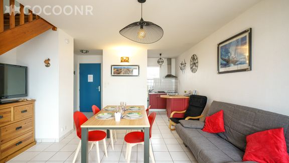 - Une pièce de vie de 22 m² avec canapé, TV, coin repas