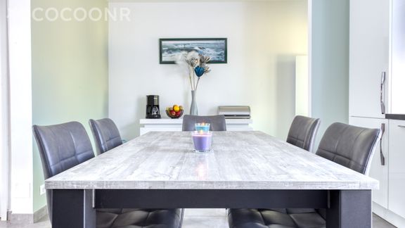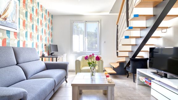 - Une pièce de vie lumineuse de 31 m² avec TV, canapé et fauteuils ouverte sur la cuisine et le coin repas.