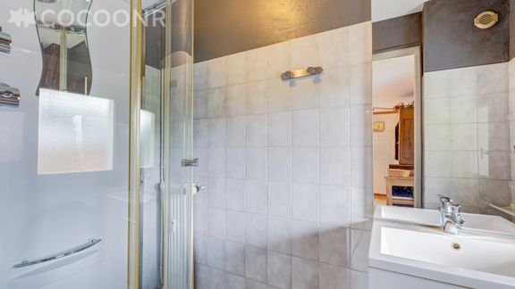 - Salle d'eau avec douche, vasque et sèche-cheveux.