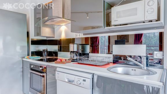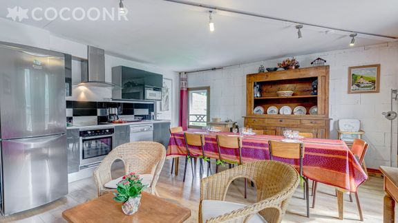 - Cuisine ouverte sur le salon, entièrement équipée : réfrigérateur, lave-vaisselle, four, micro-onde, plaques, bouilloire, appareil à raclette/fondue, grille-pain, cafetière...