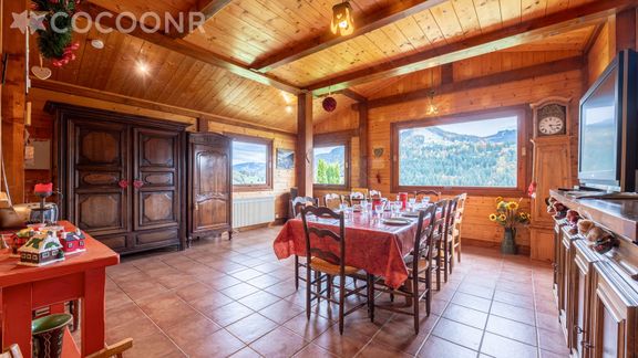 - Une pièce de vie de 30 m² avec TV et salle à manger avec vue sur le Mont-Blanc