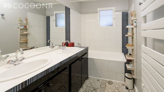 - Une salle de bain composée d'une baignoire, doubles vasques, sèche-serviettes.