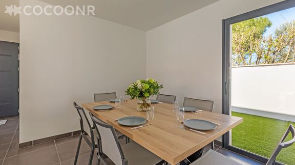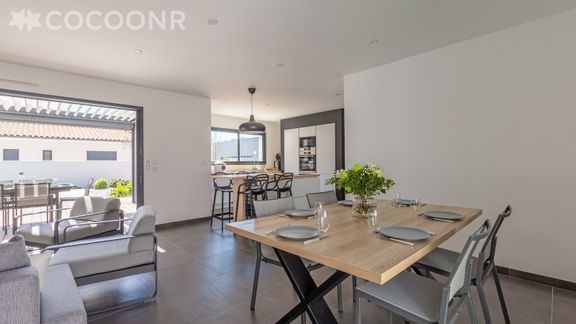 - Salon-séjour exposé SUD baigné de lumière grâce à ses 2 baies vitrées donnant sur la terrasse et la piscine. Le salon est aménagé avec table à manger, 2 fauteuils, canapé, TV écran plat.