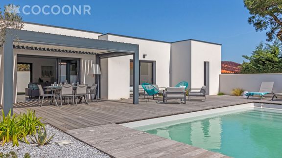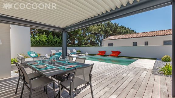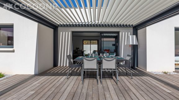 - Terrasse en bois de 80 m² avec pergola bioclimatique, salon de jardin et espace-repas extérieur, transats, plancha à gaz.