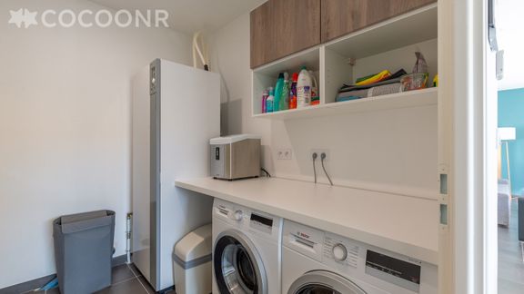 - Buanderie attenante à la cuisine avec machine à laver et sèche-linge.