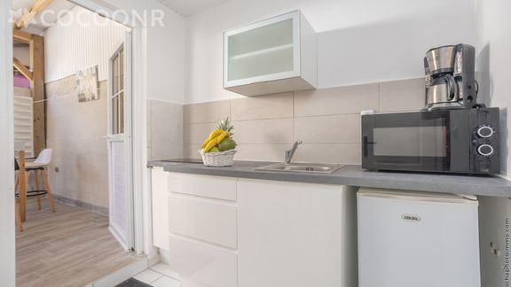 - Une cuisine ouverte équipée avec notamment : plaque induction 2 feux, évier, micro-onde, cafetière, mini frigo avec freezer...