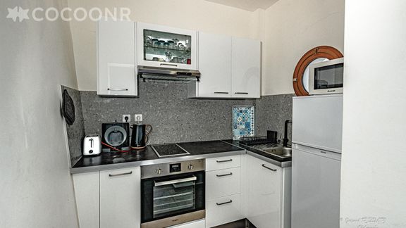 - Une cuisine ouverte équipée avec notamment : bouilloire électrique, four, four à micro-ondes, grille-pain, plaques de cuisson...